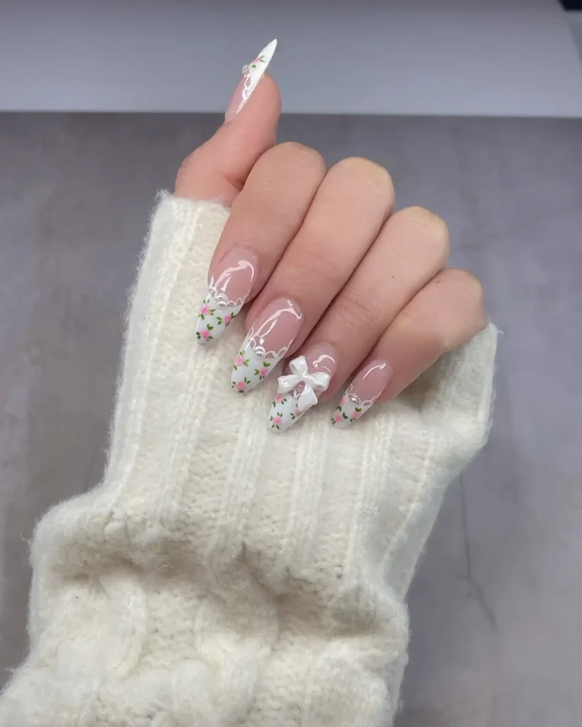 What stands out to me is the mix of soft pink bases with pastel blue and peach tips. The tiny floral accents give the nails a gentle springtime charm. This design feels airy, delicate, and effortlessly elegant.