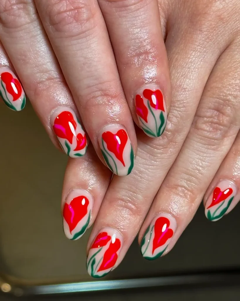 These almond nails stand out with bold red tulip designs against a neutral base. I like how the green stems balance the brightness and keep it artistic. This set feels confident and expressive, perfect when I want my nails to be the focal point.