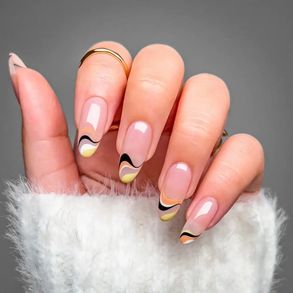 The abstract waves in soft yellow, peach, and black give these nails a trendy edge. I’m drawn to how the neutral base keeps everything balanced and wearable. This style feels modern and creative without going over the top.