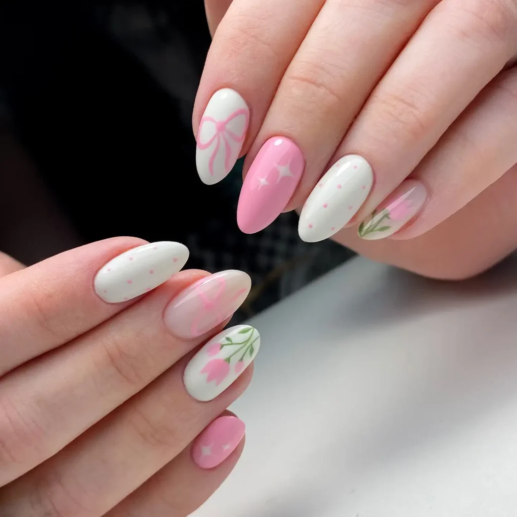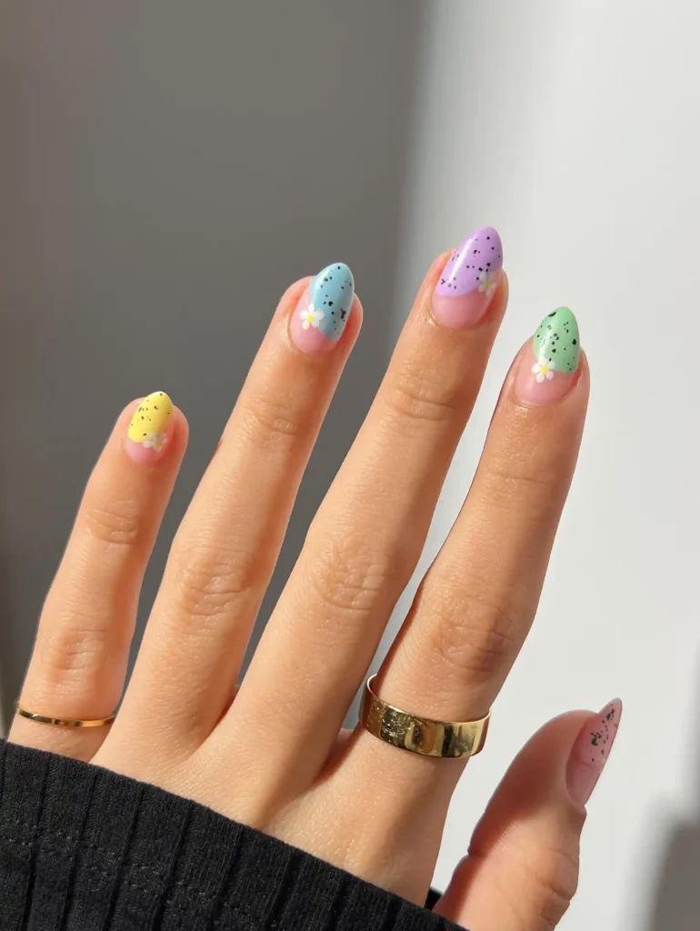 I love the soft pastel shades combined with tiny speckled details across each nail. The small daisy accents give a sweet seasonal touch. This look feels whimsical, fresh, and perfect for welcoming spring.