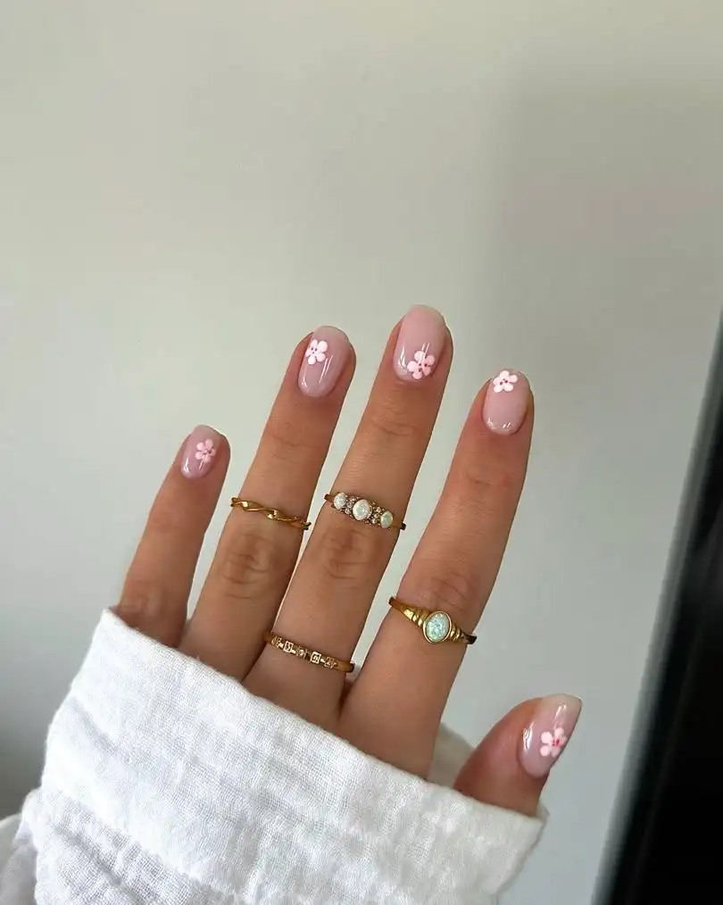 These nails feel gentle and sweet with their soft pink tones and tiny floral details. I love how the mix of solid and accent nails keeps the look interesting. It’s a calm, pretty manicure that works for everyday wear.