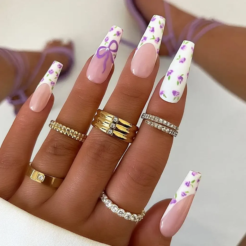 #20. Lavender Floral Coffin Nails