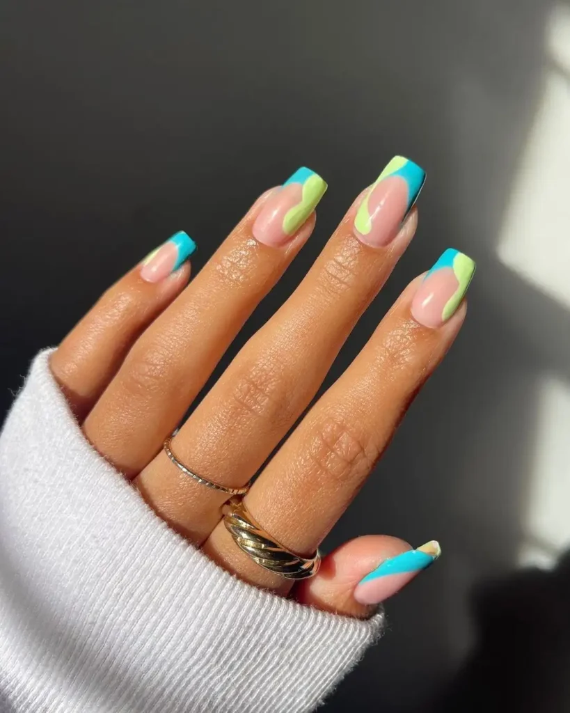 #4. Neon Green and Blue French Tip Square Nails