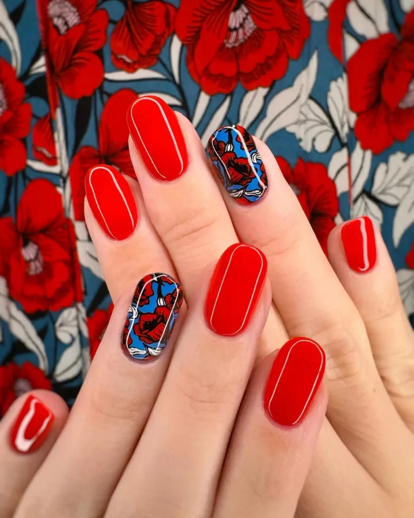 I love how the glossy red polish looks bold and polished on these rounded nails. The floral accent nails add contrast and a fresh spring twist. This design feels confident, stylish, and eye catching.