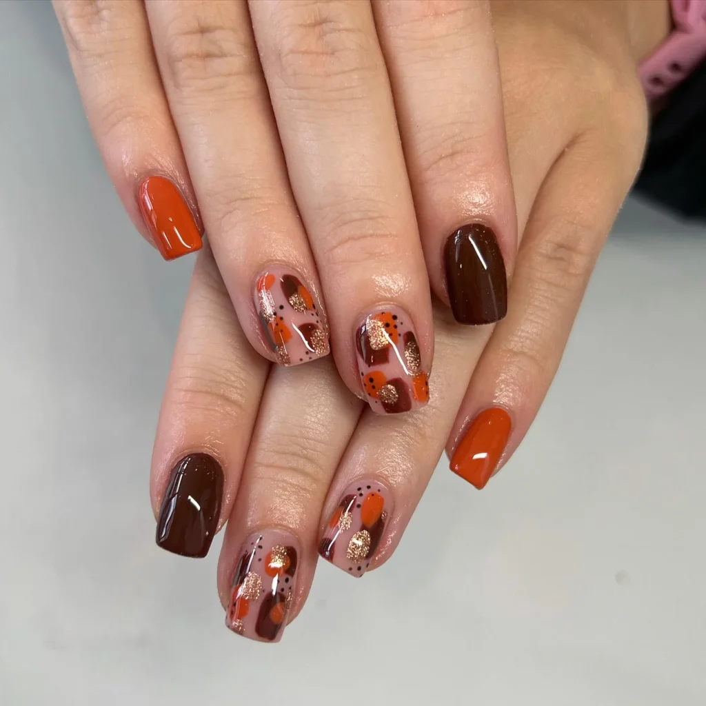 Radiating cozy autumn vibes, these nails mix glossy chocolate brown and rich pumpkin orange with artistic abstract accents. Clear bases are decorated with metallic copper foil, speckled dots, and brushstroke patterns that feel playful. Each nail is slightly different, creating a curated but natural variation that mimics the unpredictability of falling leaves.