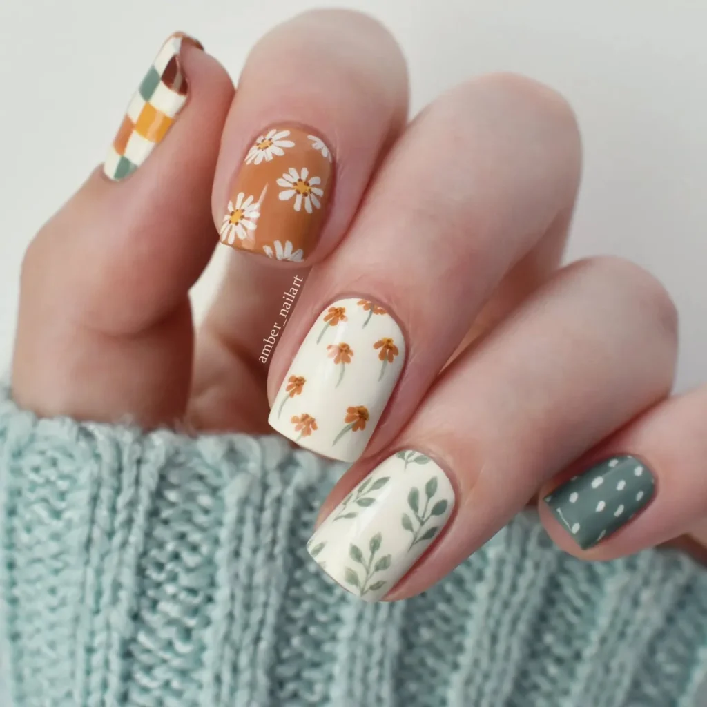Fun and eclectic, these nails showcase a mix of patterns in one cohesive autumn palette. Terracotta nails are dotted with white daisies, ivory nails feature tiny orange flowers, while leafy greens and plaid details complete the set. A muted teal nail with polka dots adds contrast and keeps the design playful.