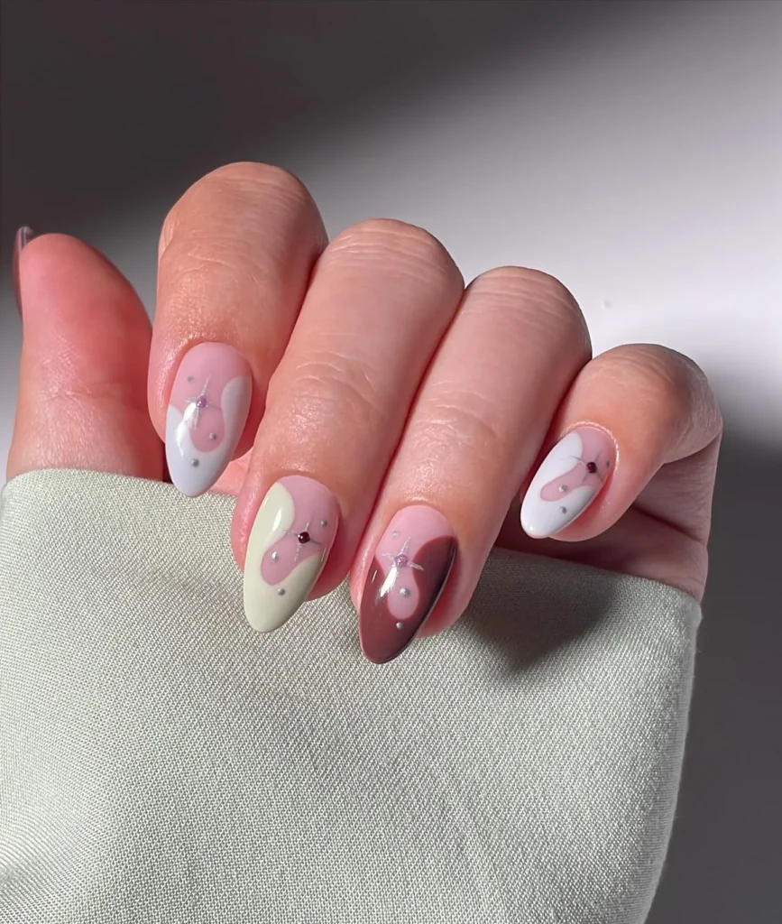Capturing the magic of autumn foliage, these nails show cascading leaf shapes in a gradient of burgundy, terracotta, burnt orange, and golden beige. Each leaf looks as though it’s gently falling, starting small at the cuticle and expanding outward, which creates a dynamic sense of movement. The nude base allows the warm hues to stand out while keeping the overall style light and refined.