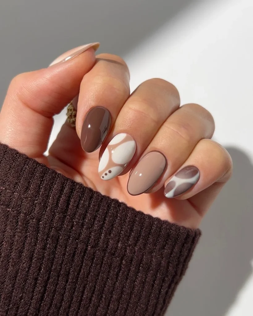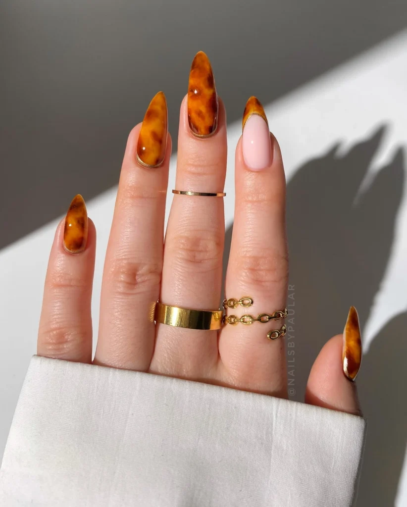 Embracing the playful side of fall, these nails merge earthy tortoiseshell bases with Halloween-inspired art. Metallic copper spider webs stretch across rich brown backgrounds, while cheeky ghost designs appear against ivory nails, adorned with falling leaf motifs. Golden metallic touches elevate the design, giving it a polished yet festive vibe.