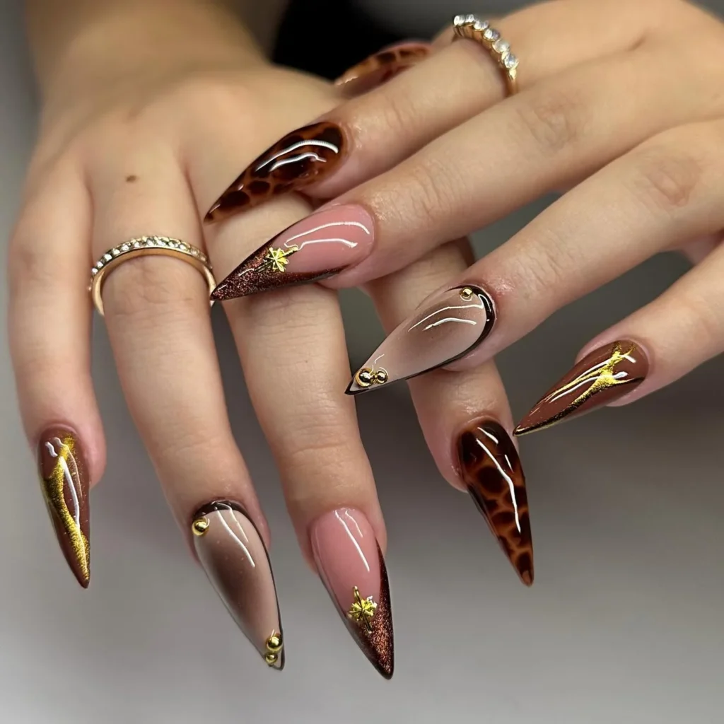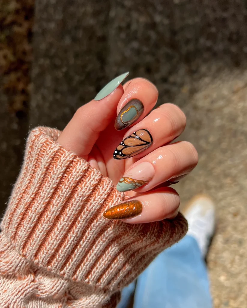 This manicure takes inspiration from the beauty of butterfly wings, transforming them into wearable autumn art. Deep brown bases are outlined with golden metallic details, while some nails are painted with monarch-style wing patterns edged in tiny white dots. Other nails glow with molten bronze shimmer, creating contrast and richness in the set.