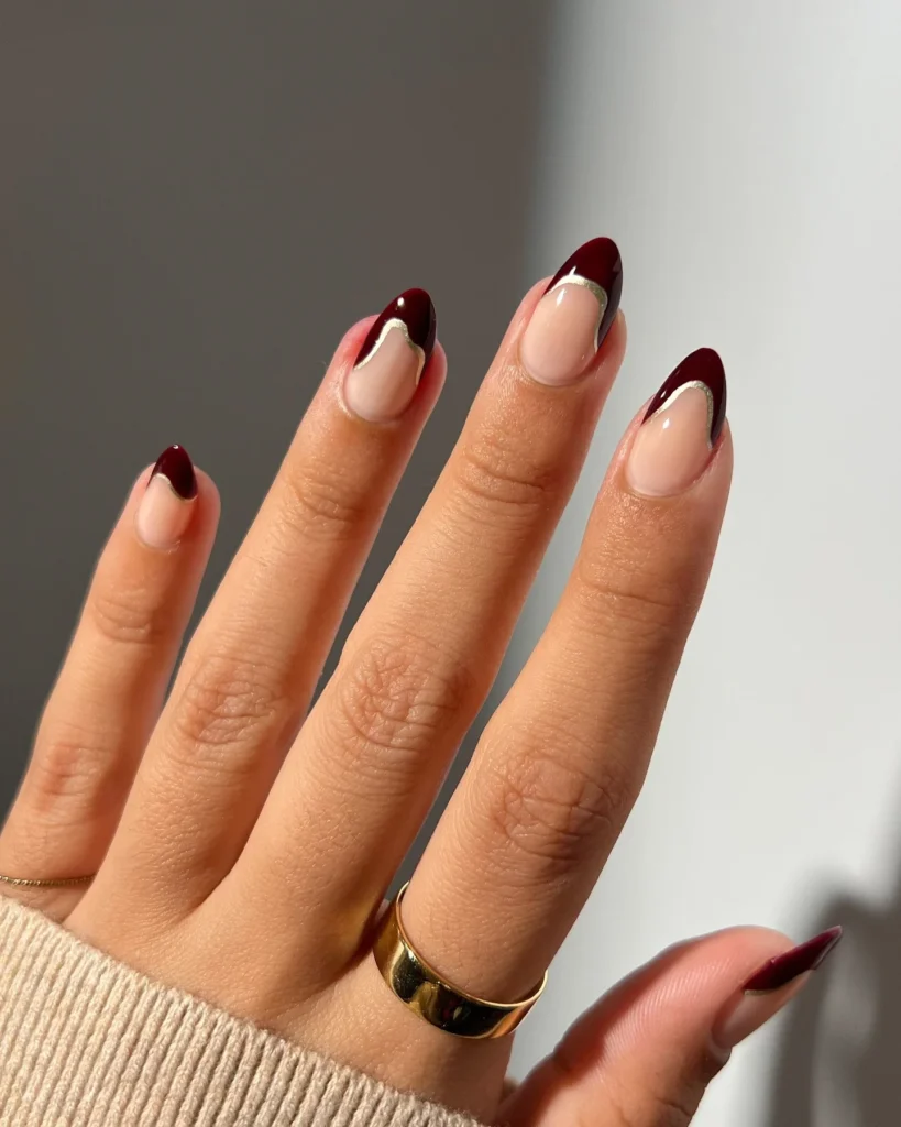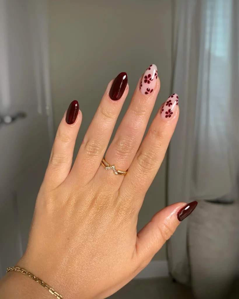 This set blends boldness with delicacy, pairing a rich glossy burgundy with subtle floral accents on nude bases. The flowers, painted in deep burgundy, echo autumn blossoms while still feeling minimal and chic. The almond shape elongates the fingers and highlights the artistry without overwhelming the design.