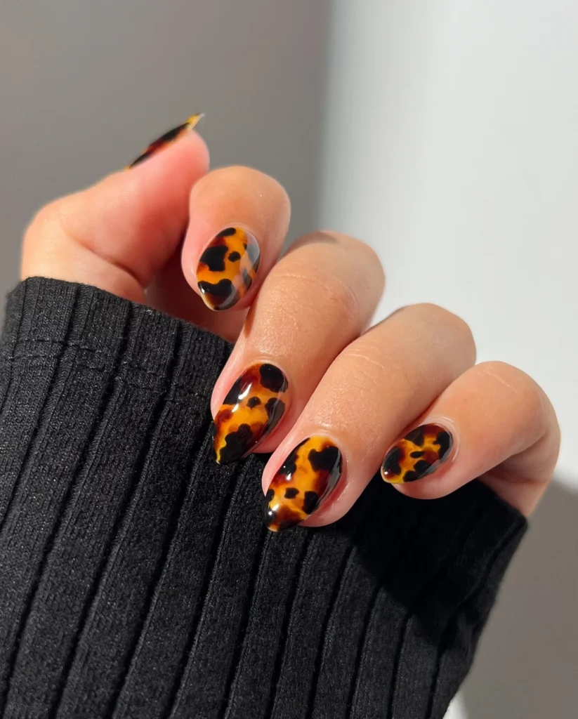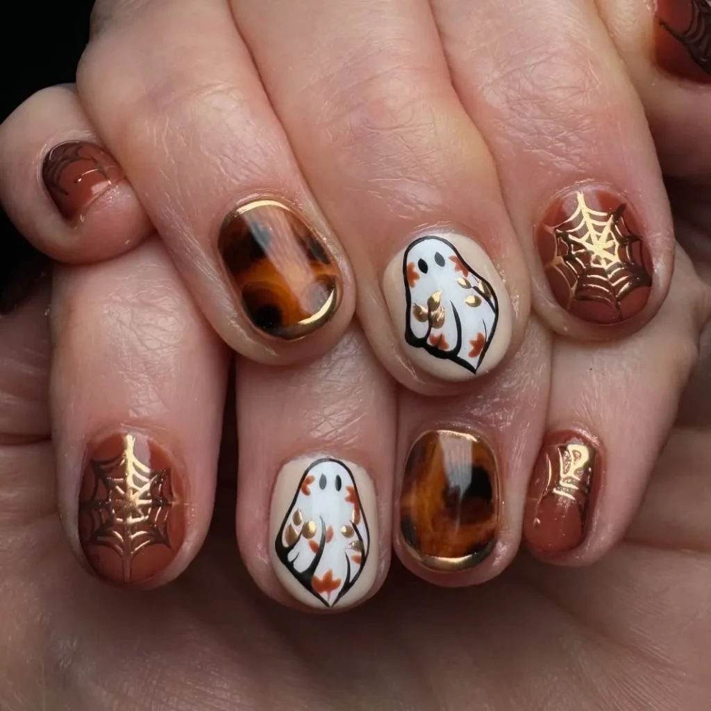 Whimsical yet chic, this Halloween-inspired manicure fuses fall shades with playful artistry. Rich tortoiseshell nails sit alongside metallic copper spider webs and adorable ghost designs outlined in black. Tiny autumn leaves float around the ghosts, tying the look back to seasonal motifs.