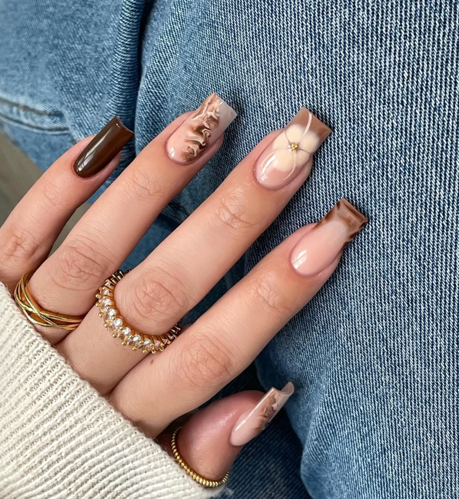 Inspired by the falling leaves of autumn, this manicure showcases cascading leaf motifs in shades of burgundy, rust, amber, and beige. The gradient effect creates movement, with each nail resembling a line of leaves drifting gently to the ground. The nude base keeps the look refined, allowing the warm tones to glow naturally.