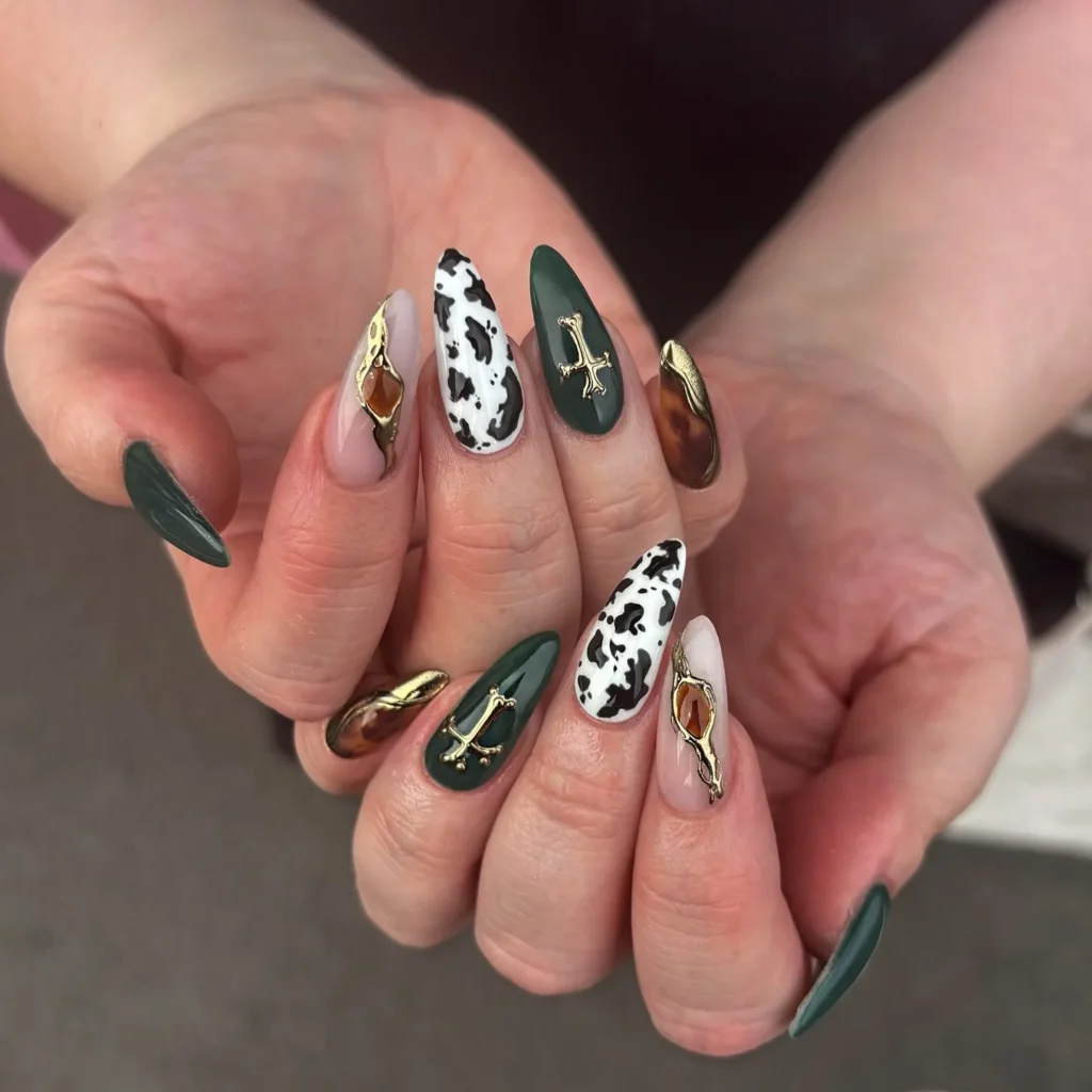Playful and eclectic, these nails combine multiple patterns in one cohesive fall-inspired palette. Terracotta bases feature daisies, ivory nails display tiny orange blossoms, and muted green nails showcase leafy sprigs and dotted designs. A plaid accent nail completes the look, bringing a cozy, sweater-weather vibe.