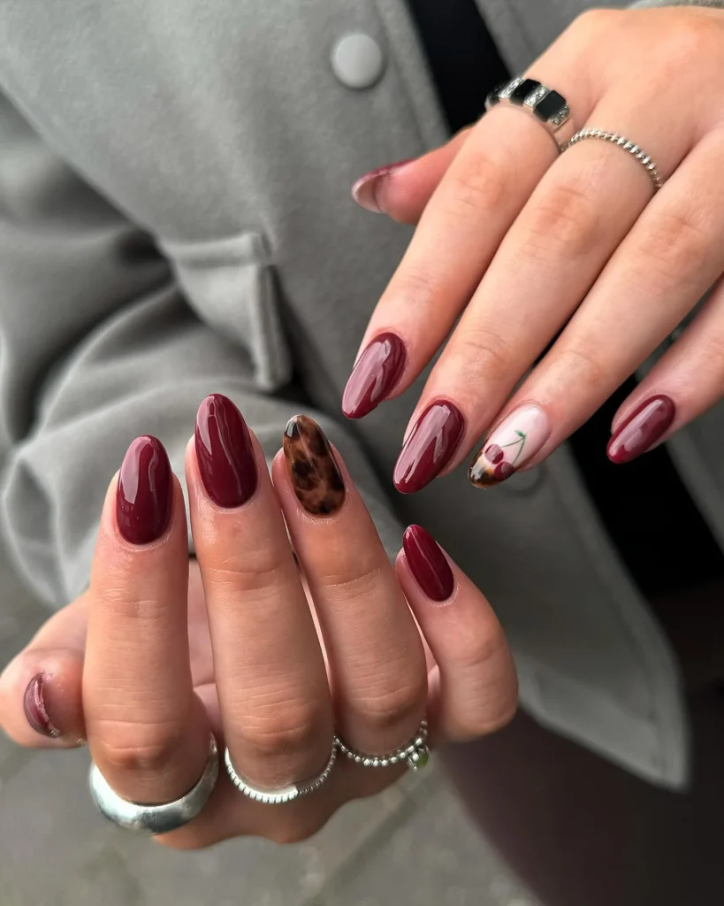 Dramatic and stylish, these nails showcase deep glossy burgundy enhanced by bold accents. One nail displays a tortoiseshell pattern, adding warmth and depth, while another features a dainty cherry branch painted over a nude base. The glossy burgundy captures the richness of autumn evenings, while the accents add artistry and individuality.