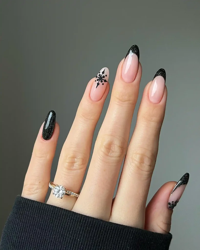 Nothing says classy like black with a hint of glitter. This design mixes soft nude tones with deep midnight tips and subtle snowflake accents, like a starry night captured on your fingertips.
