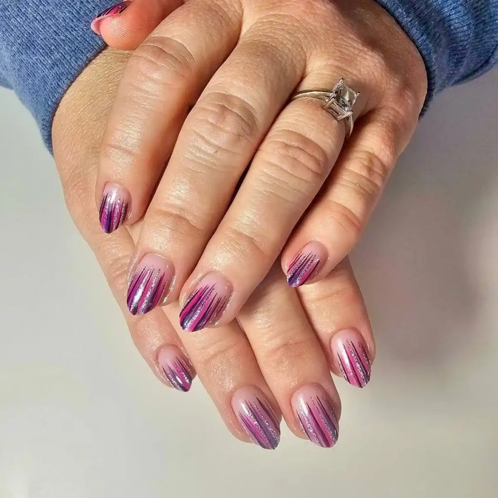 This manicure is pure celebration energy, pink shimmer meets metallic streaks that mimic party lights.