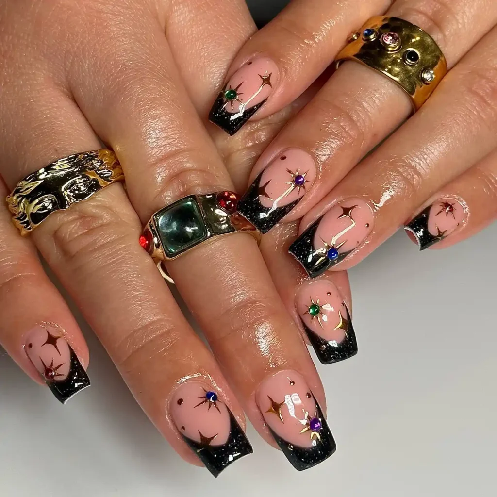 These glossy black french tips feel dressy and sharp. Gold starbursts and small gems catch the light like party lights. The nude base keeps everything balanced and clean.