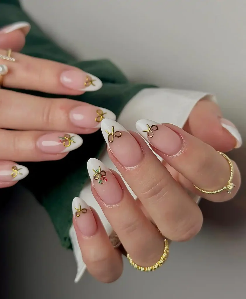 I went for a soft look that still feels festive. The tiny metallic bows sit like neat gift ties. A small sprig detail adds a gentle holiday touch.