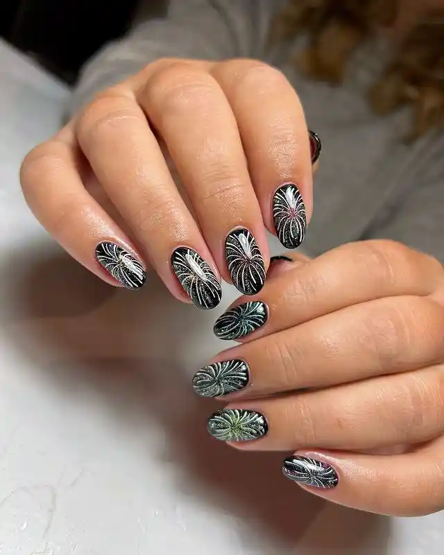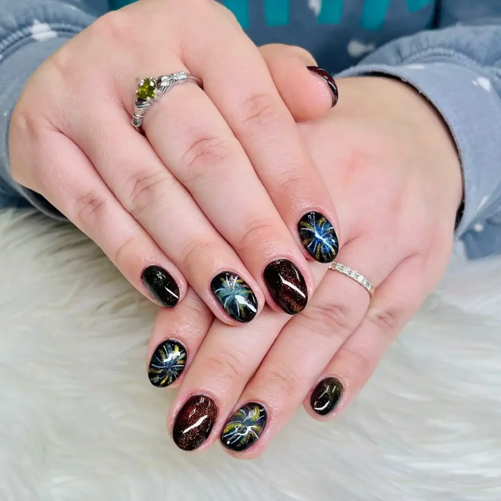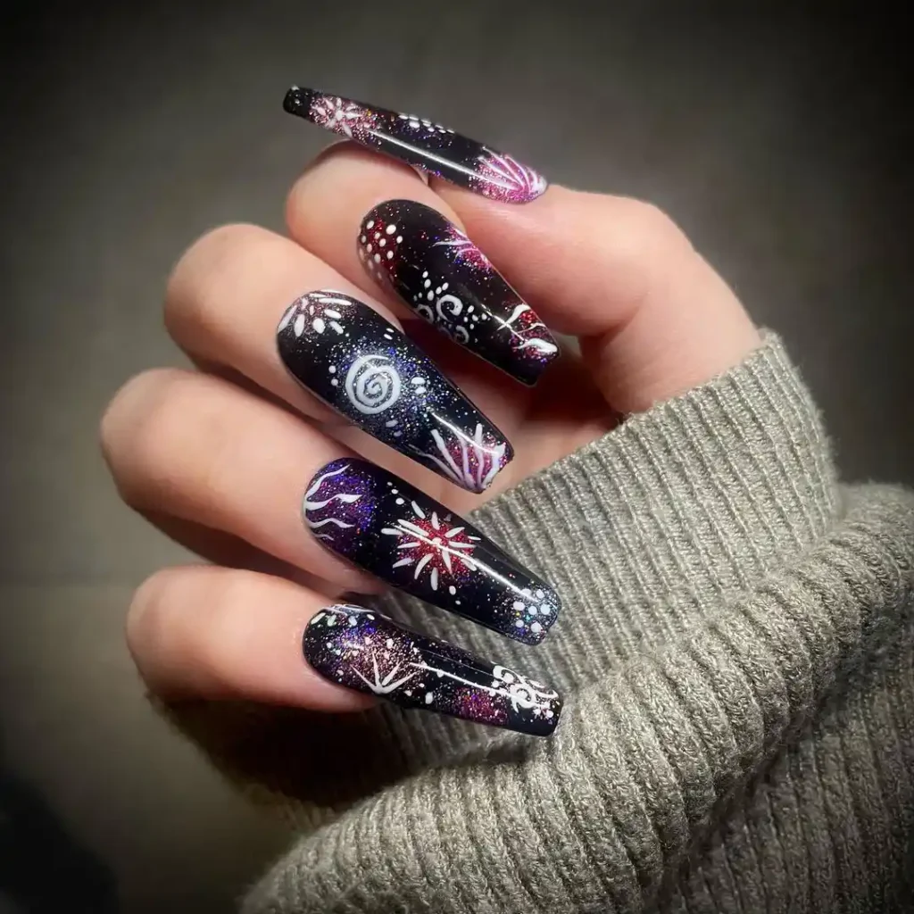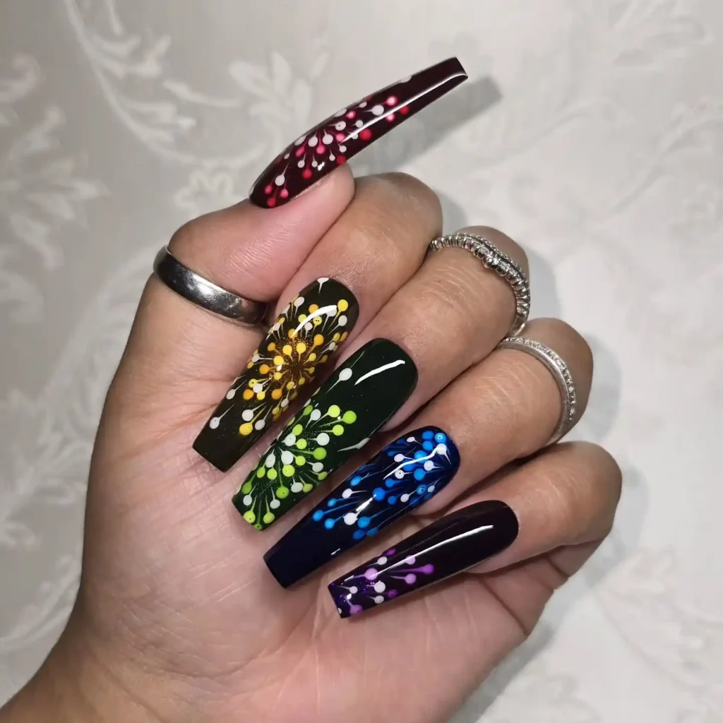 Each nail shows a different burst of color. The dark backgrounds make the dots glow like fireworks. It feels bold and perfect for the first night of the year.