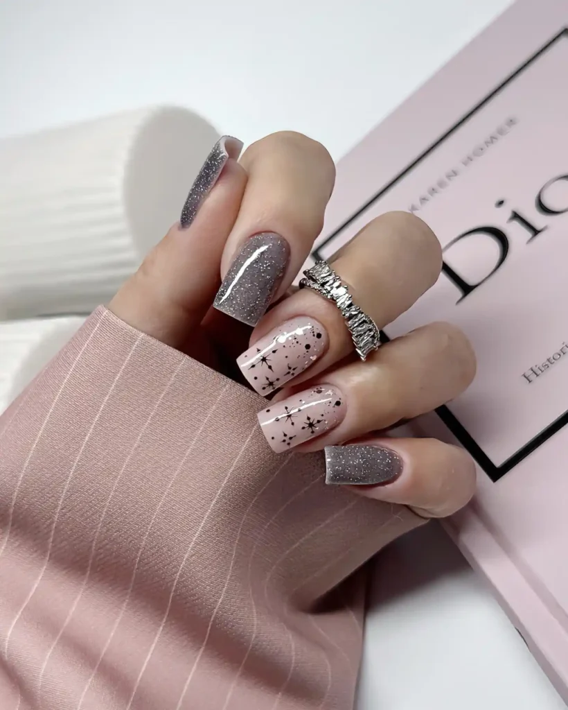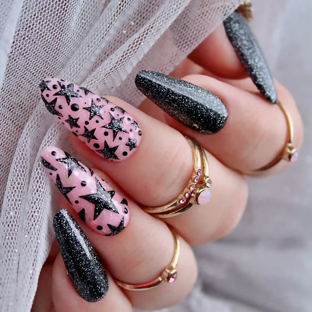 The pink base with black stars looks playful and sleek. Glittered charcoal nails add depth and shine. The mix reads like a fun party sky.