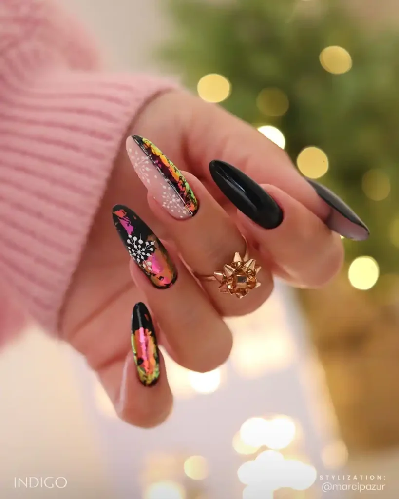 I love how the foil flashes orange, pink, and green. One soft nude accent and a white snowflake ground the colors. The black nails frame the shine and feel modern.