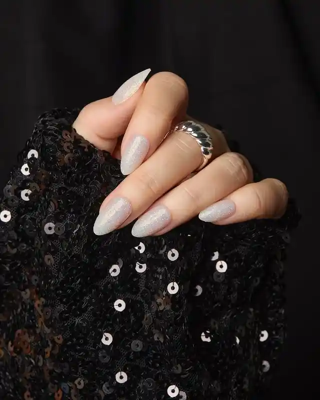 This full set is quiet and elegant. The fine sparkle gives a soft frost effect. The almond shape elongates my fingers and pairs well with evening wear.