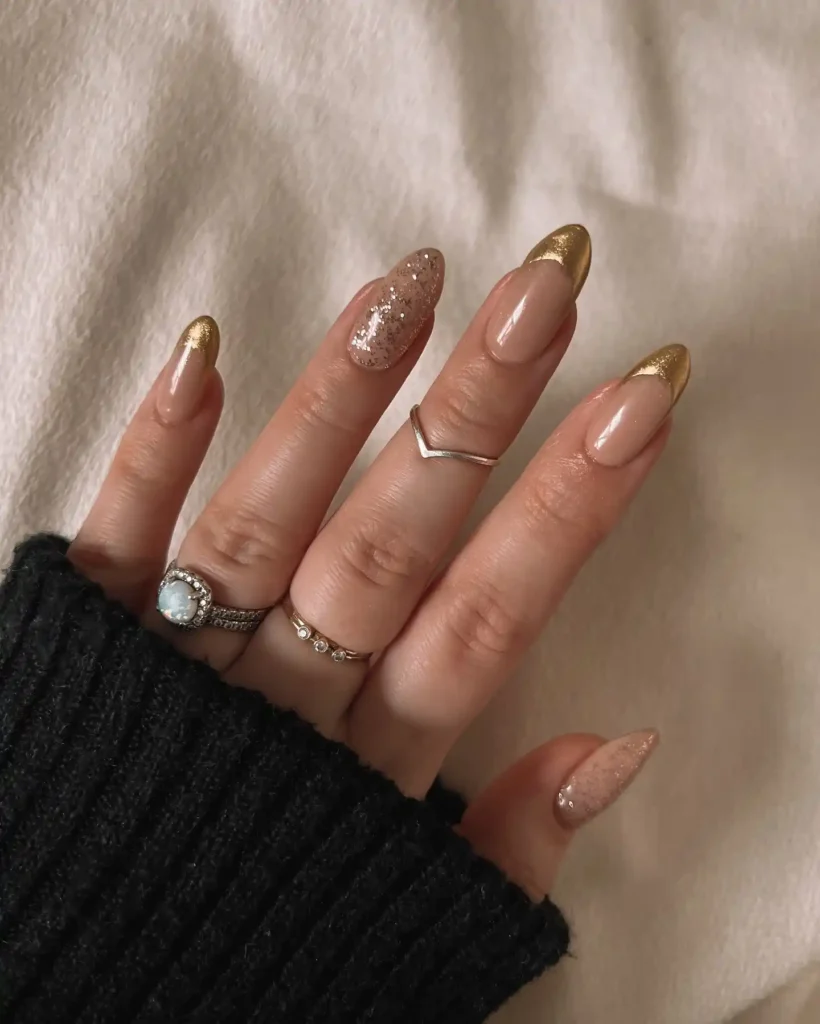 If “main character energy” were a manicure, this would be it. Soft beige nails kissed with gold tips and a sprinkle of glitter timeless, elegant, and just the right amount of extra.
