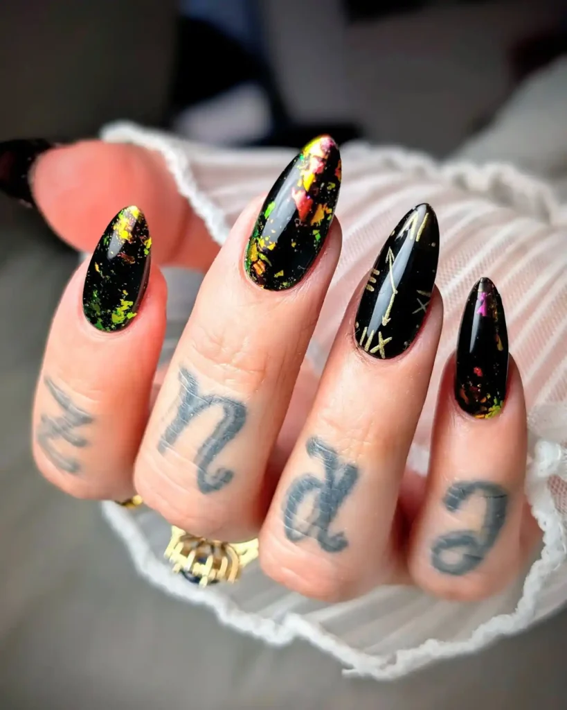 Crushed neon foils flicker over a black base. A single nail shows gold Roman numerals for the countdown. The rounded shape keeps the bold palette sleek.