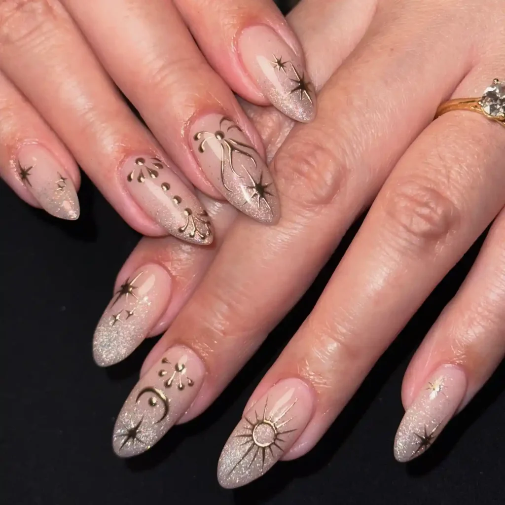 These nails look straight out of a constellation chart, tiny gold stars, moons, and sparkles scattered over a champagne-shimmer base. It’s giving cosmic goddess meets New Year’s Eve glam.