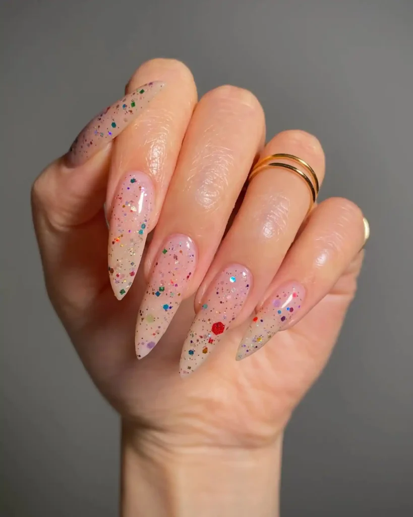 Why wait for the ball to drop when your nails can be the party? These confetti-inspired nails burst with multicolored glitter over a soft nude base, playful, fun, and unapologetically festive.