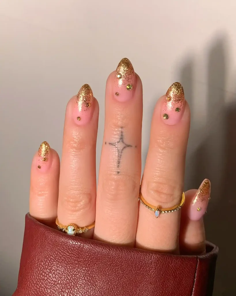These nails shimmer like a champagne toast under soft candlelight. A blush base topped with gold glitter and tiny gemstones, simple yet show-stopping.