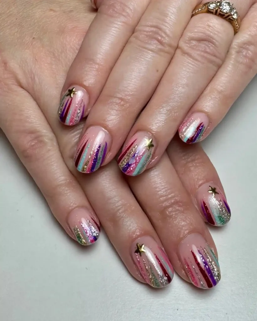 This one’s all fireworks and fun, pastel pinks, electric blues, metallic purples, and gold stars streak across the nails like confetti ribbons. It’s a celebration you can wear.