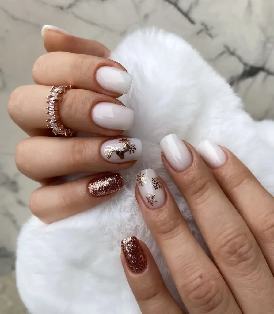 These nails look like winter mornings wrapped in satin. A creamy white ombré paired with rose gold glitter and delicate snowflake decals, understated yet luxurious.
