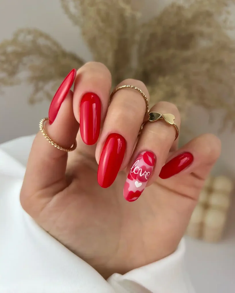 I’m instantly drawn to the rich glossy red shade that feels bold and confident on the almond shape. The single accent nail with soft pink tones and handwritten love detail adds a romantic twist. This design feels classic yet playful, perfect for a trendy Valentine look.