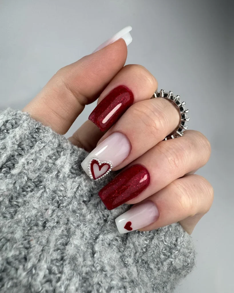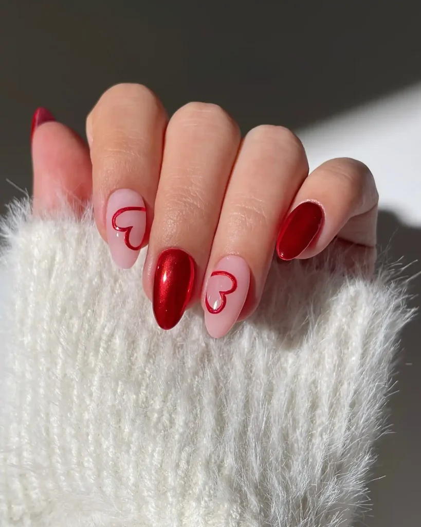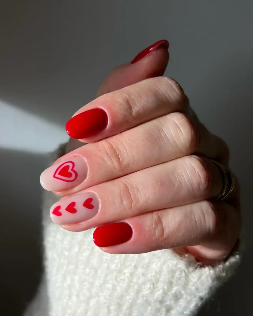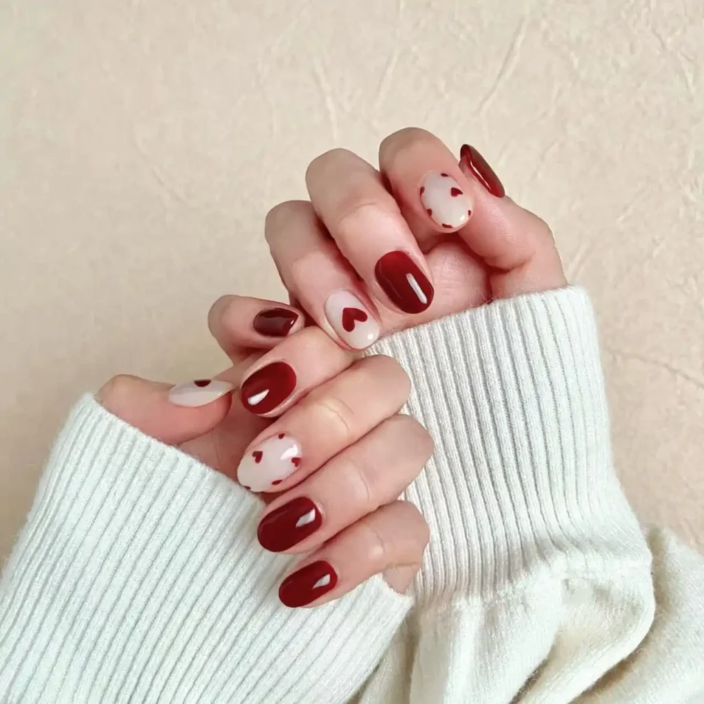 I love how the deep red polish pairs with creamy nude nails covered in tiny heart details. The short rounded shape makes the design feel cozy and easy to wear. This look gives relaxed Valentine vibes with a cute and casual feel.