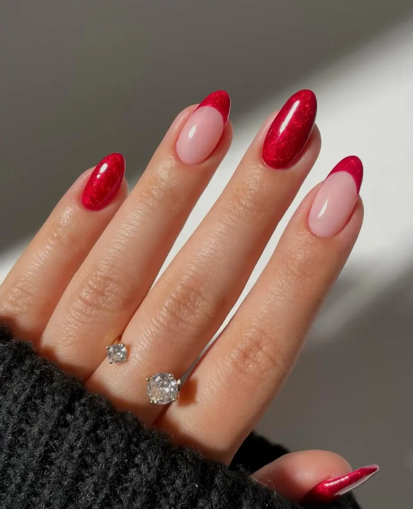 These nails stand out with their sparkling red French tips against a soft nude base. The almond shape keeps the shimmer looking refined instead of overwhelming. This style feels elegant, festive, and perfect for a polished Valentine moment.