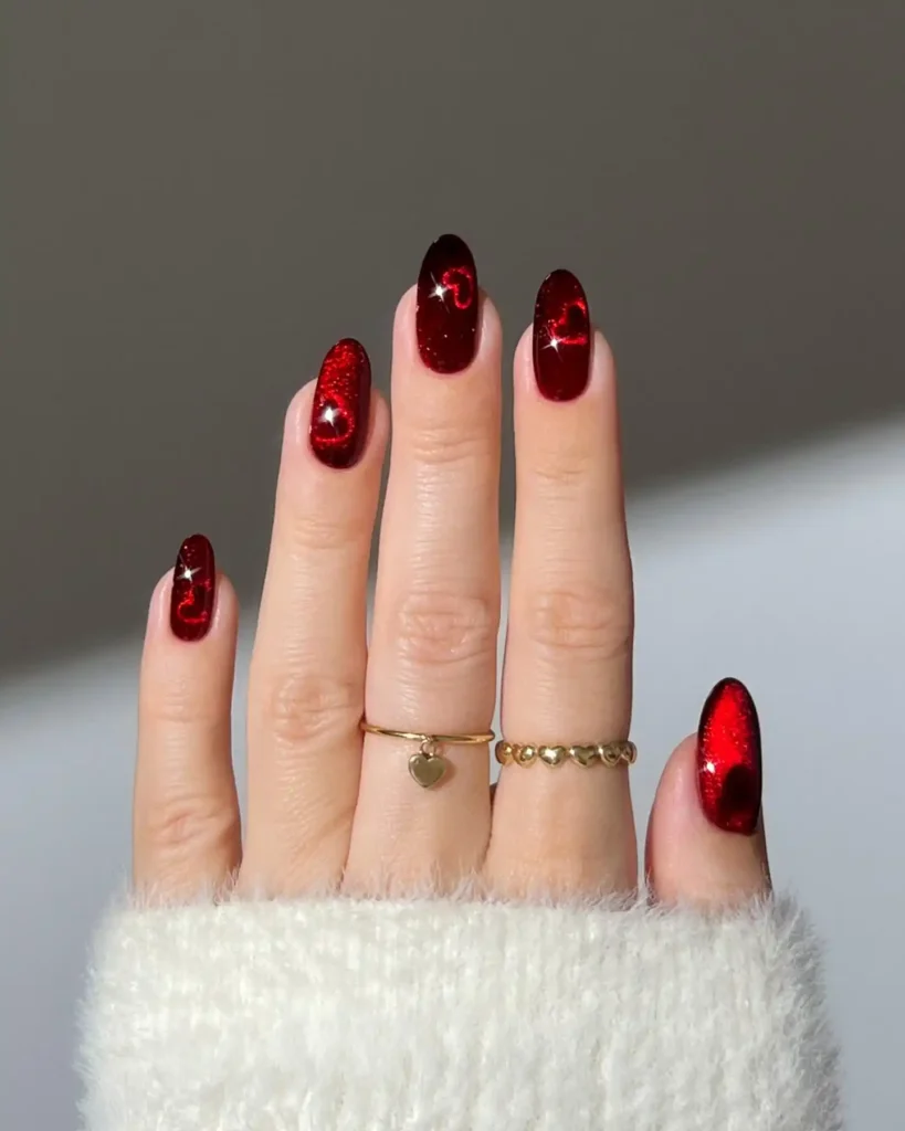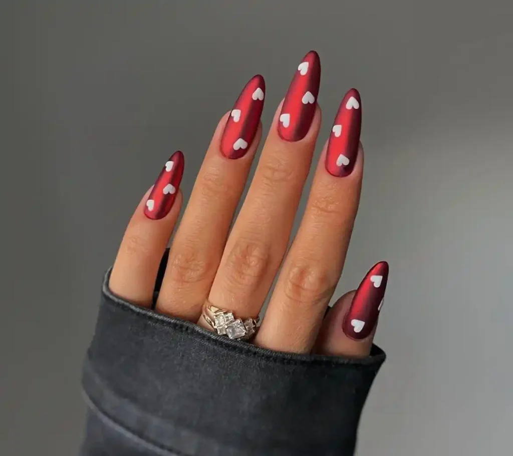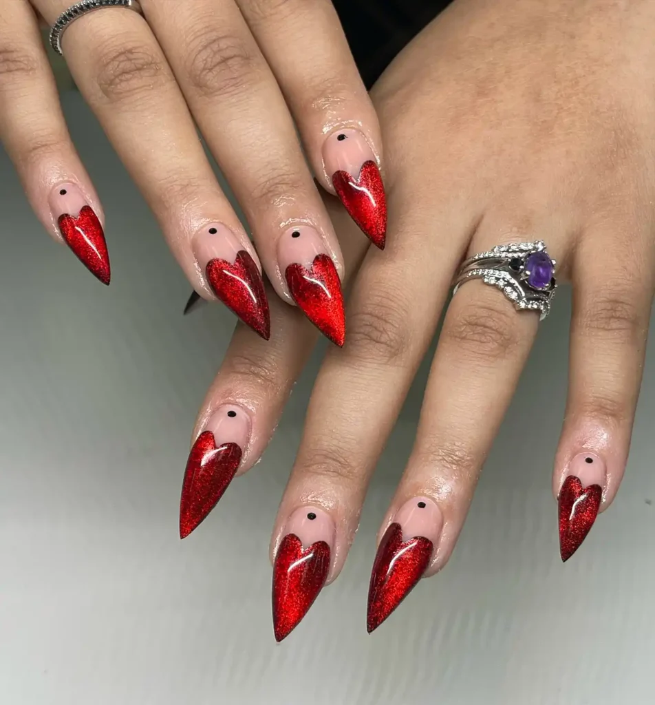 I’m drawn to the metallic red hearts that shine beautifully against the natural base. The stiletto shape gives the nails a bold edge while still feeling refined. This look feels powerful, romantic, and ideal for a statement Valentine manicure.