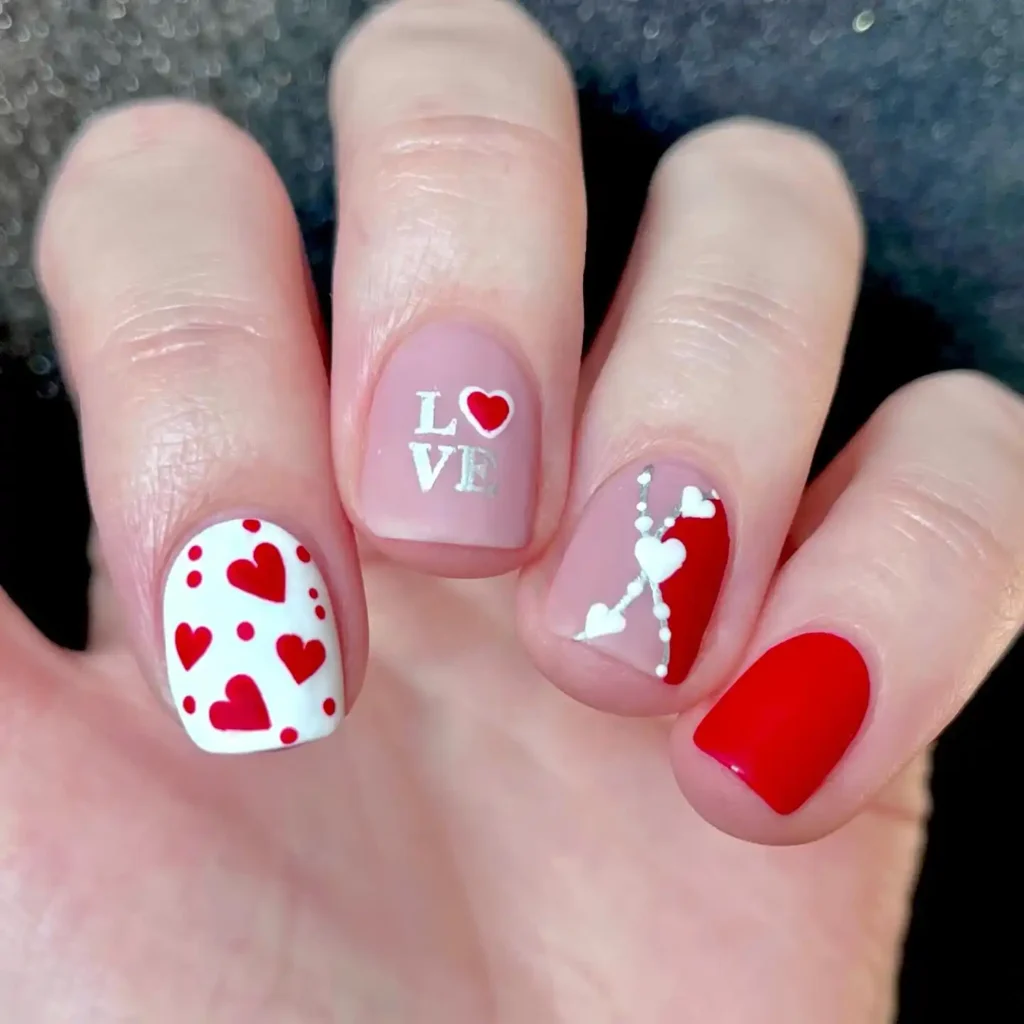 What catches my eye here is the mix of red, white, and soft pink that feels sweet and expressive. The heart patterns and love lettering give this manicure a cute, personal touch. It feels cozy, fun, and perfect for celebrating Valentine’s Day in a cheerful way.