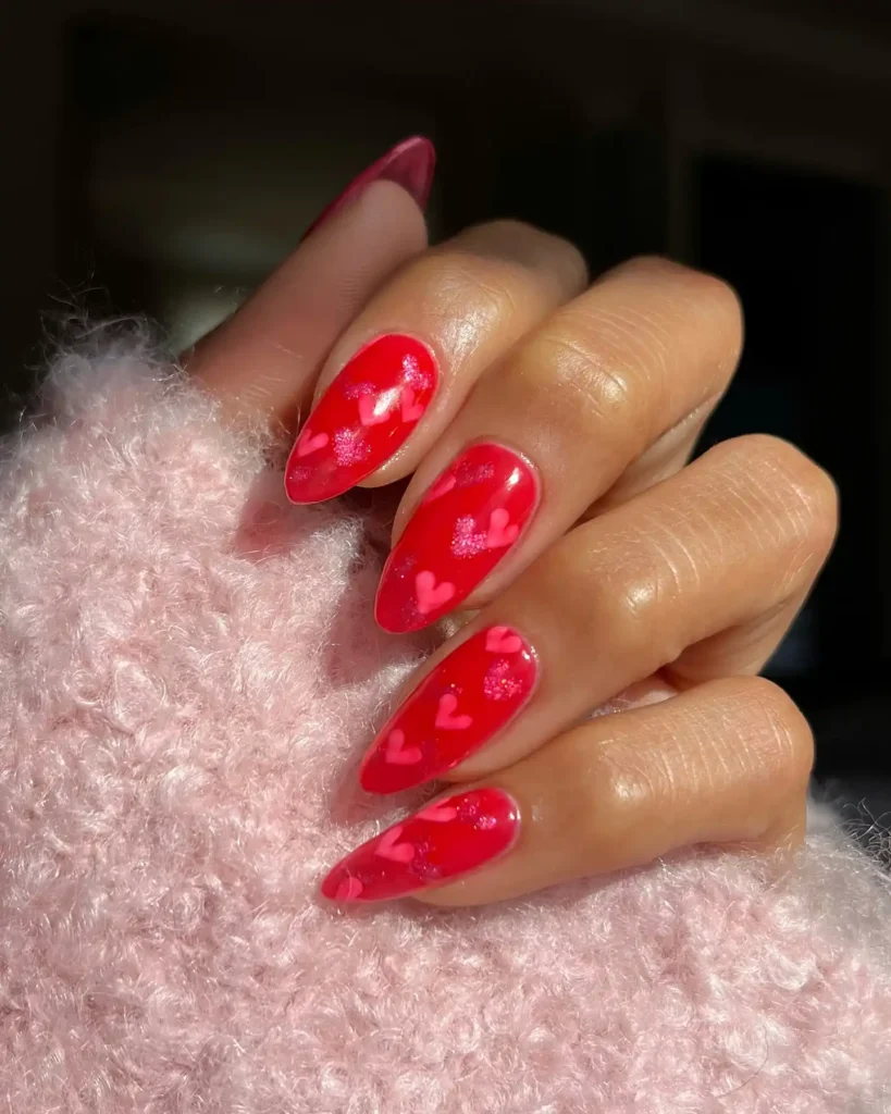 #19. Red Glitter Almond Nails With Pink Heart Details