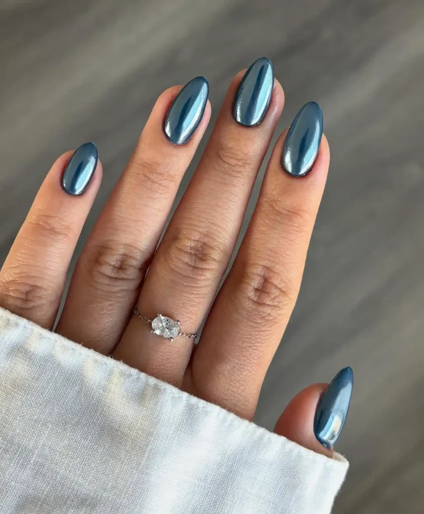 I went for a deep blue chrome that looks like polished steel. The almond shape keeps it sleek and feminine. The mirror finish catches every bit of light. It pairs perfectly with silver jewelry and a cool toned outfit.