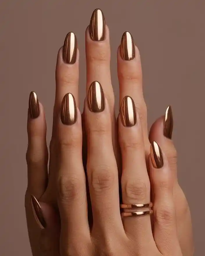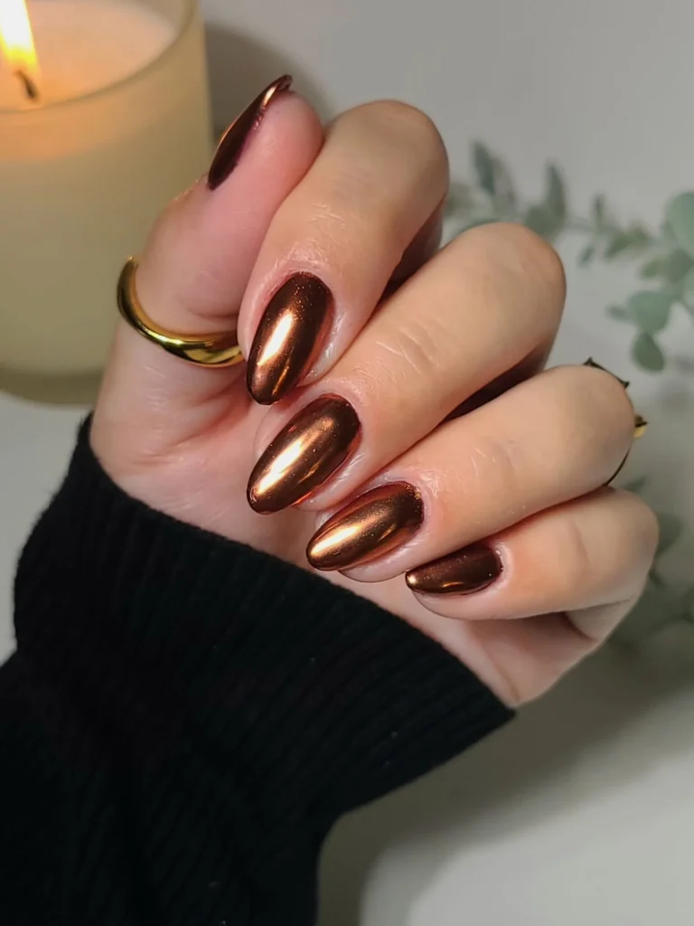 I chose a warm copper chrome that glows like candlelight. The finish is smooth and reflective, almost like liquid metal. Almond tips keep it feminine and soft. It gives cozy autumn energy without losing gloss.