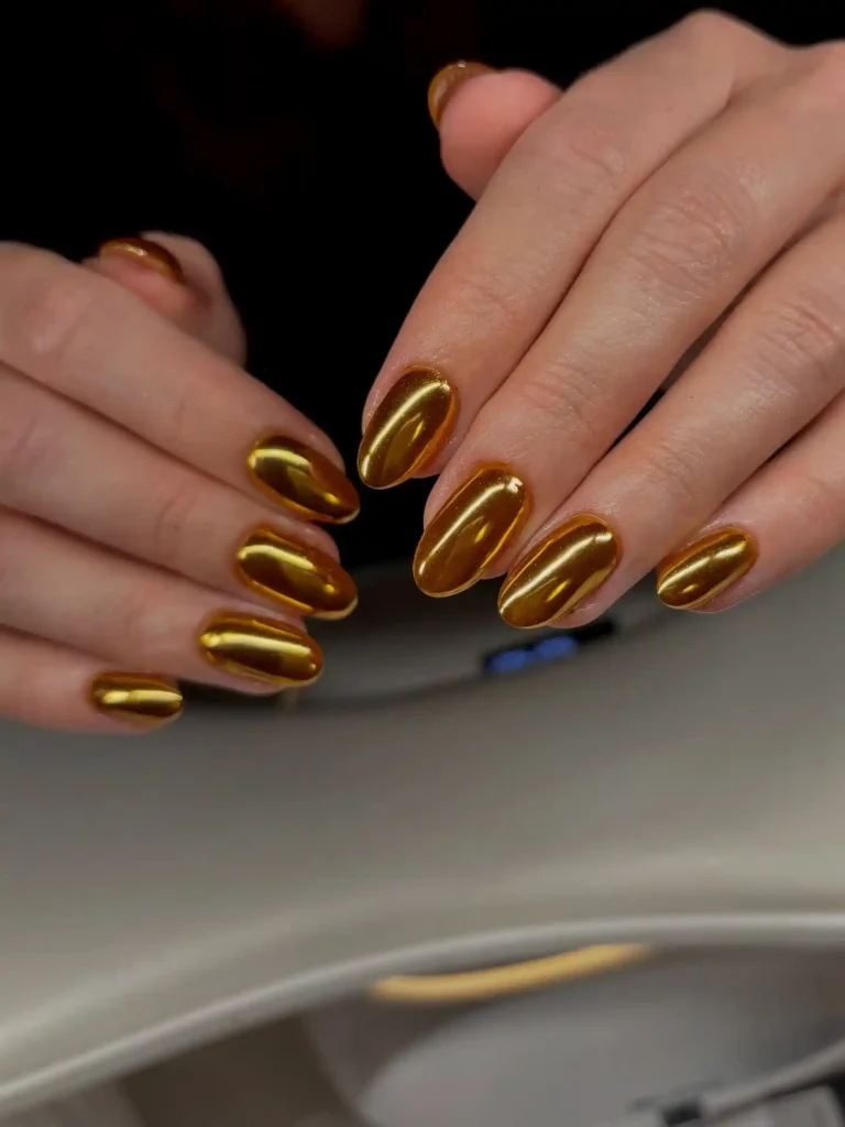 Nothing beats full gold chrome when I want drama. The mirror finish turns every gesture into a flash of light. Medium almond tips feel comfortable and luxe. I pair it with minimal jewelry and let the nails do the talking.