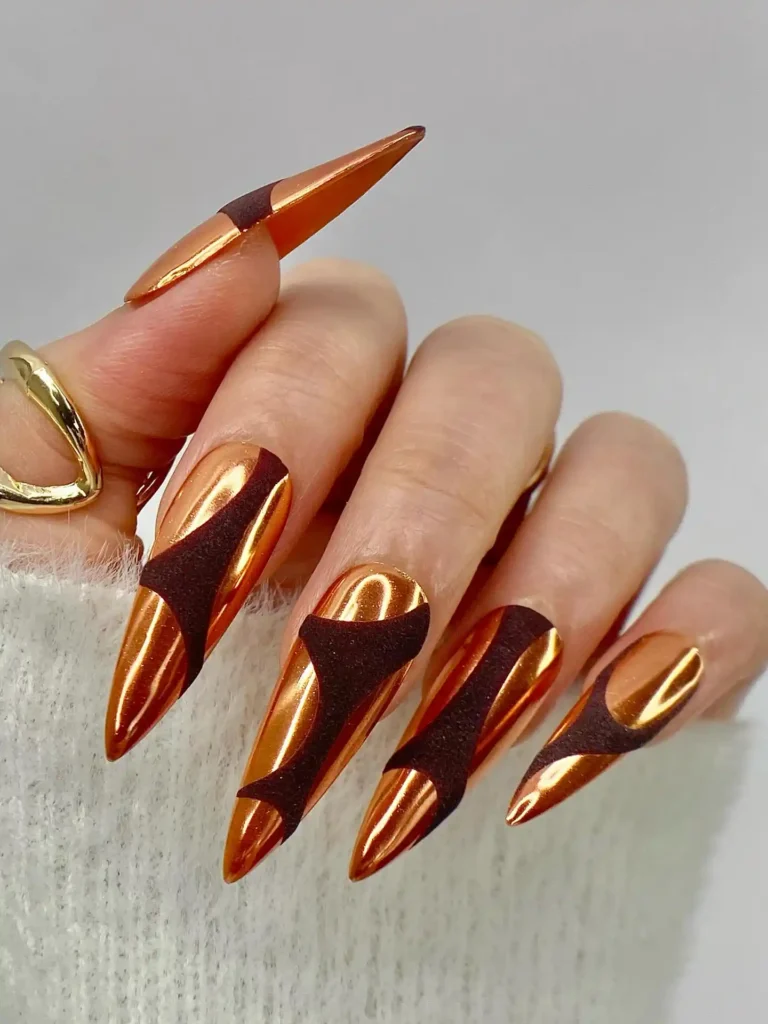 I went full stiletto with copper chrome and velvety black shapes. The negative space creates sharp geometry that frames the shine.