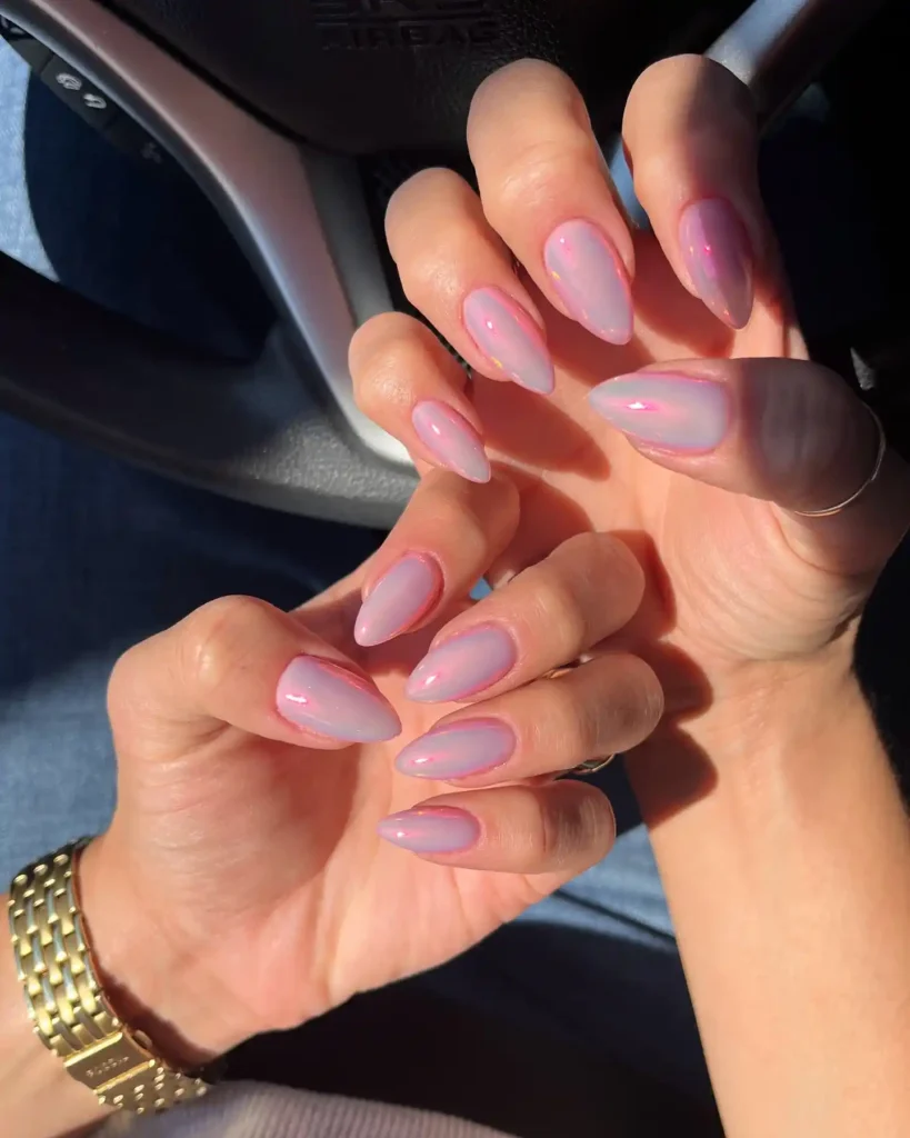 This pink chrome flashes lilac when the sun hits. The glow looks soft in shade and vivid in daylight. I wear it when I want color without loud art. It feels fun and romantic at the same time.