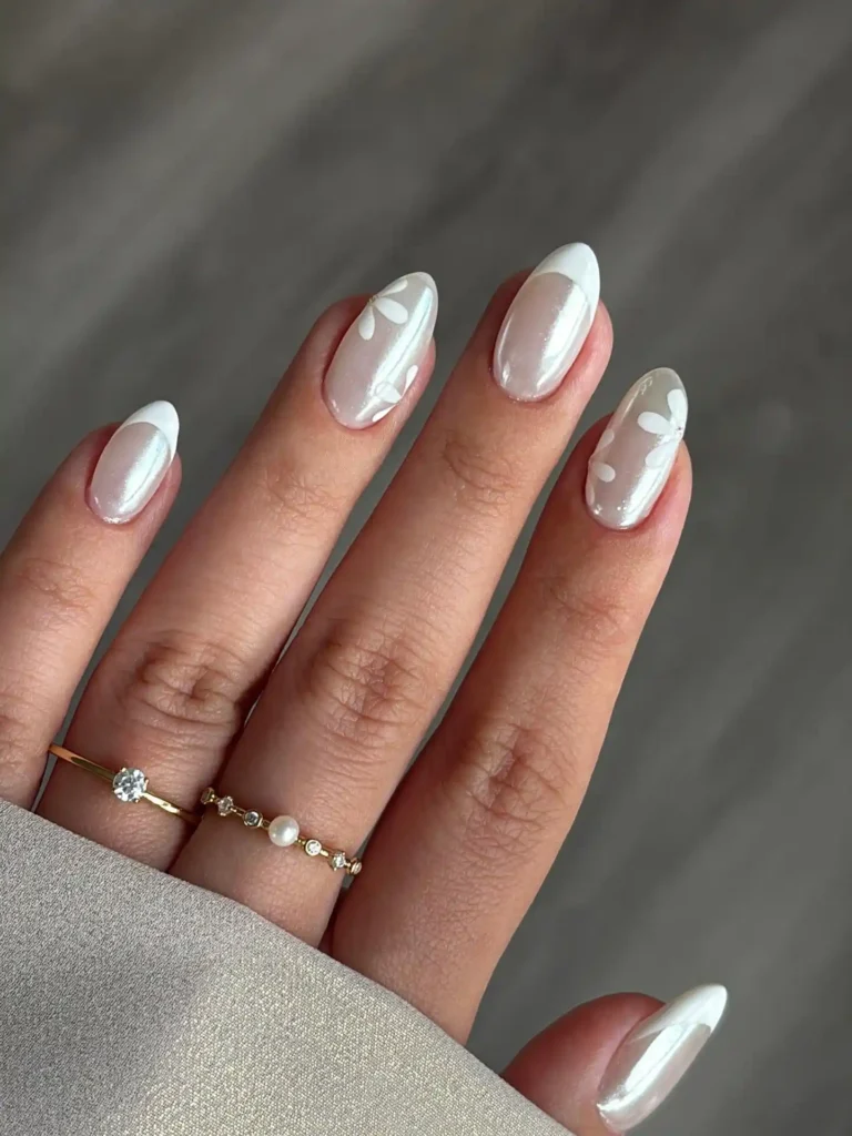A pearly chrome base meets tiny white petals and a soft French tip. The details are crisp and airy. It looks fresh for spring and still elegant for events. I love the delicate contrast.
