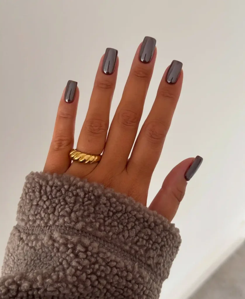 Short square tips with gunmetal chrome keep things modern. The mirror sheen adds edge to a simple outfit.