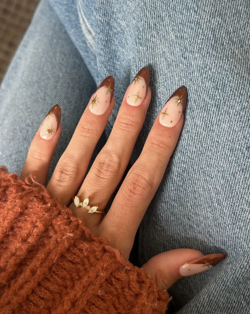 A sheer base sets off cocoa chrome tips. Tiny golden stars sparkle along the edges. The mix feels cozy and celestial. I wear it with denim and warm sweaters.