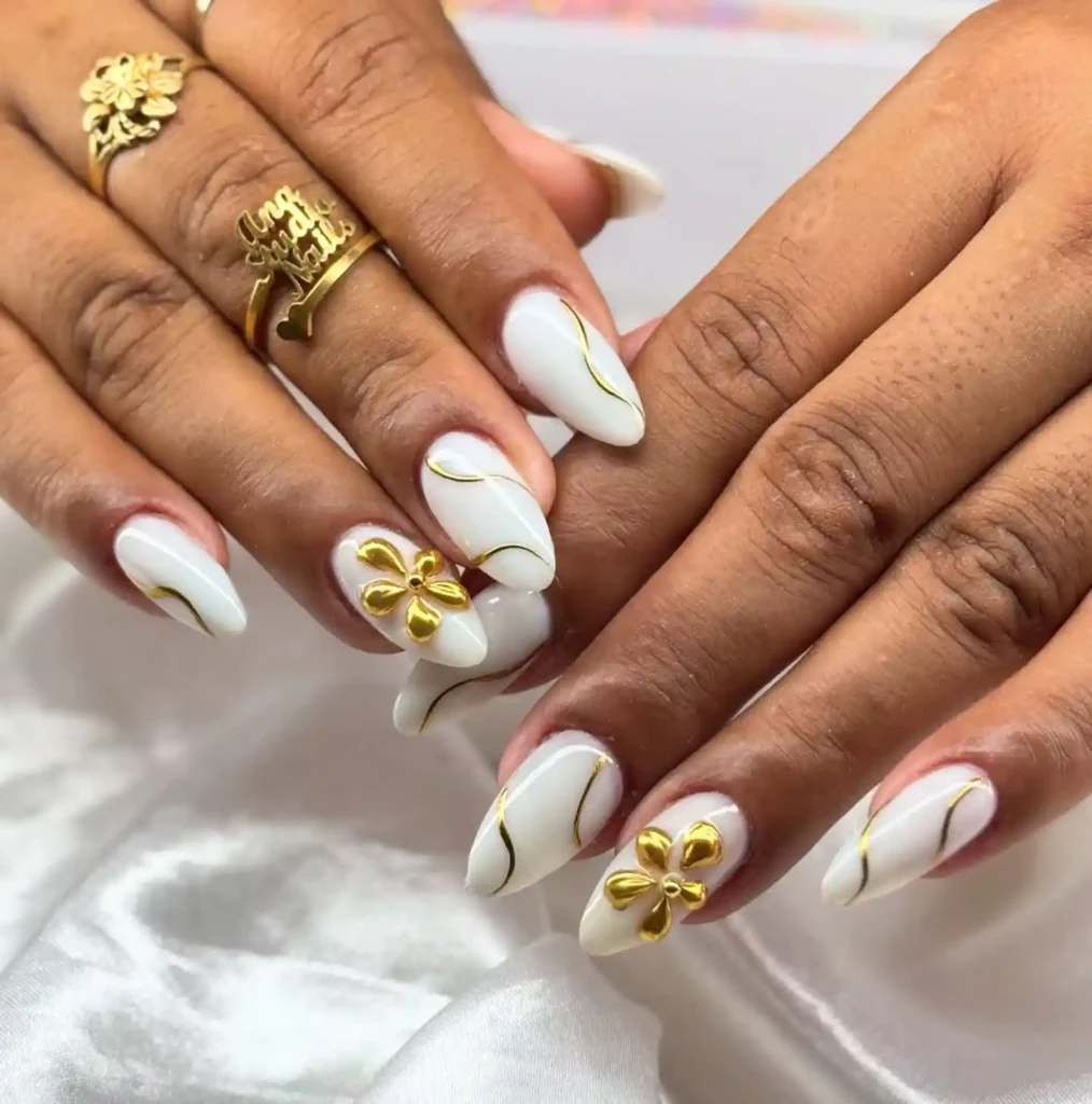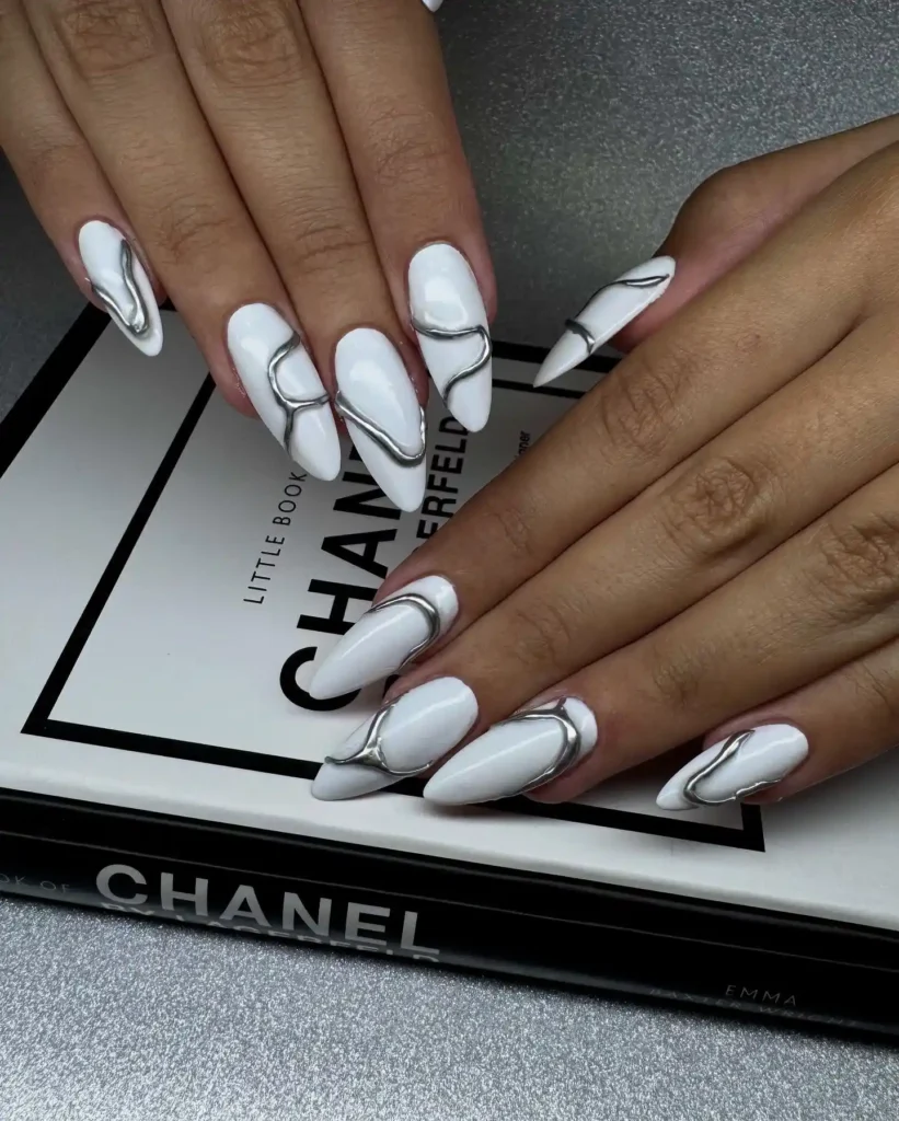 Glossy white almonds get a metal upgrade here. Raised silver lines curve across each nail like liquid chrome. The contrast feels modern and chic. It is minimal with a high-fashion twist.