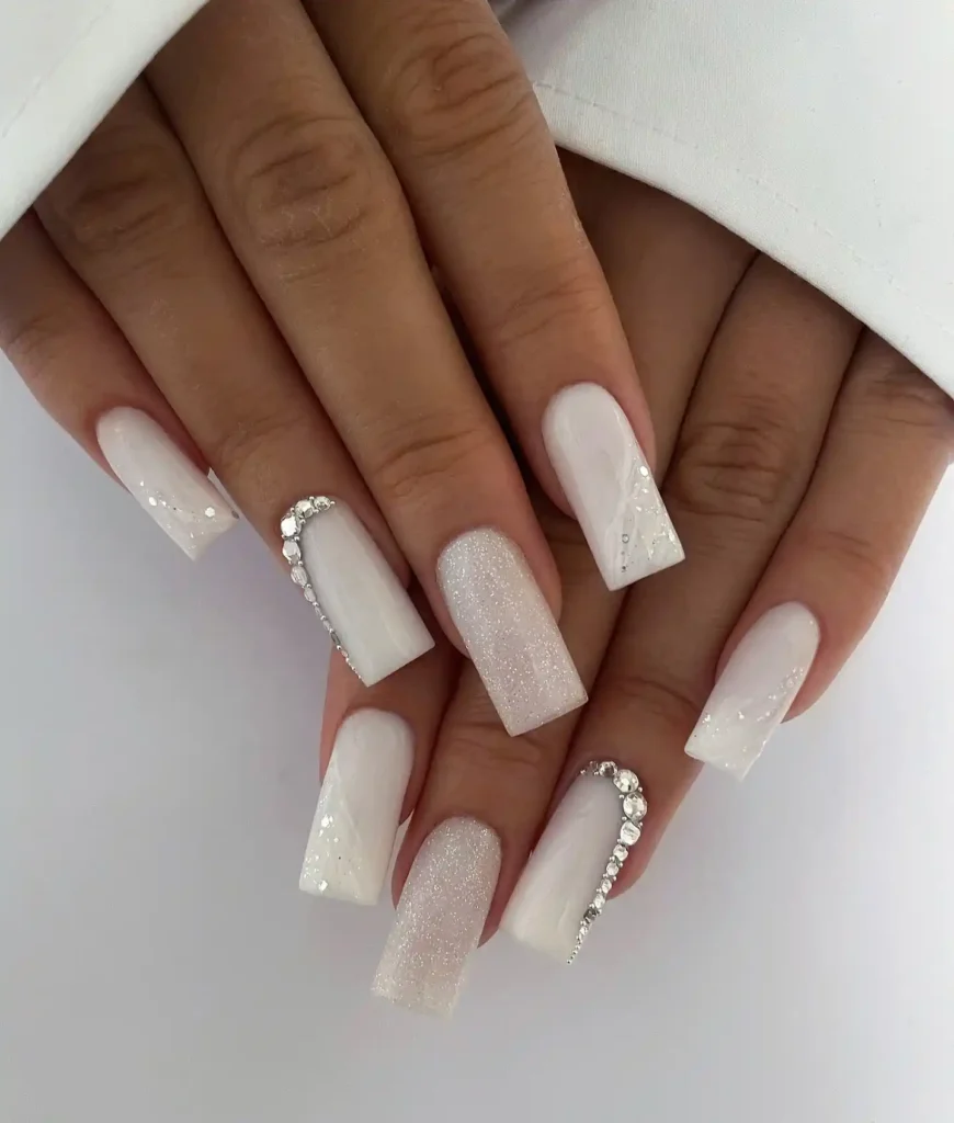 I wanted luxury, so I added pearls and gold studs. The long square nails mix matte and glossy white.