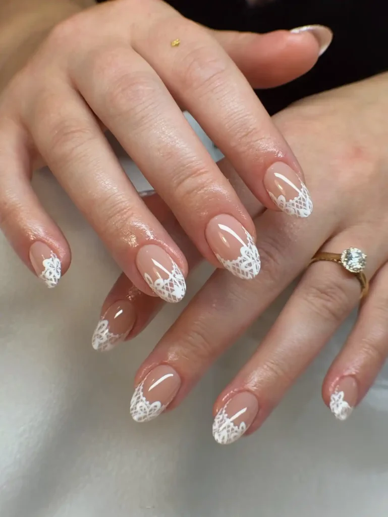 These tips look like lace laid over nude polish. The pattern is delicate and romantic. The glossy finish keeps the design fresh. It feels dressy but still light enough for every day.